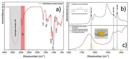 Proximate analysis was performed according to the AOAC [31], and infrared spectroscopy analysis was performed using an FTIR (Thermo Scientific iS50) coupled with an ATR, with a diamond crystal mounted on tungsten carbide. This technique was used to determine the chemical structure of an analytical grade curcumin standard and isolated turmeric starch. The sample spectra were collected at 64 scans using Omnic 9, version 9.5.9 software at a resolution of 4 cm−1. The obtained spectra were processed using the following procedure to eliminate the effects of the crystal and for comparison with the transmission spectra from the equipment’s database: