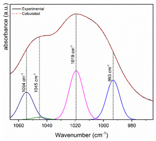 To execute the curve fitting in Omnic software, the spectrum was not normalized, and all mathematical treatments were performed in absorbance mode. The goal of spectral curve fitting is to generate individual peaks from a spectrum which, when added together, match the original data. Convergence is the process by which this occurs. Curve fitting involves three steps: selecting initial profiles (line shapes and baseline handling), selecting initial parameters (width, height, and location), and optimization [33].