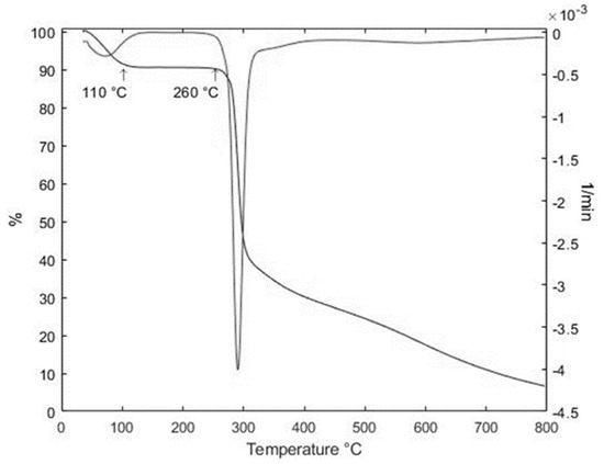 The thermal degradation of starch was evaluated using a Metter Toledo TGA/SDTA 85E thermogravimetric analyzer. A total of 10 mg of the sample was placed in a crucible and examined at a heating rate of 10 °C/min and a temperature range of 25–600 °C in a nitrogen atmosphere of 30 mL/min.