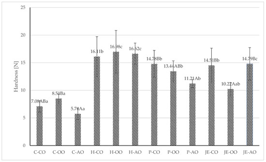 Hardness [N] of fried plant-based meat analogues. C—control group, H—honey group, P—propolis group, JE — jalapeno extract group, CO—canola oil, OO—olive oil, AO—acai oil; (A–C)—averages in columns with different letters show statistically significant differences between samples with the same antioxidant component, but different type of plant fat; (a–c)—averages in columns with different letters show statistically significant differences between samples with the same type of plant fat, but different antioxidant component; p ≤ 0.05.