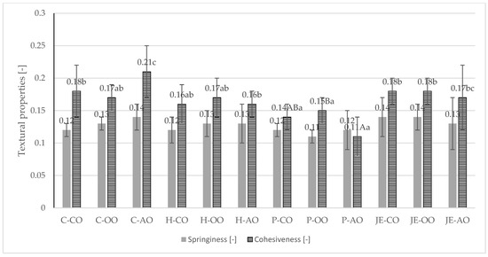 Springiness [-] and cohesiveness [-] of fried plant-based meat analogues. C—control group, H—honey group, P—propolis group, JE—jalapeno extract group, CO—canola oil, OO—olive oil, AO—acai oil; (A–C)—averages in columns with different letters show statistically significant differences between samples with the same antioxidant component, but different type of plant fat; (a–c)—averages in columns with different letters show statistically significant differences between samples with the same type of plant fat, but different antioxidant component; p ≤ 0.05.