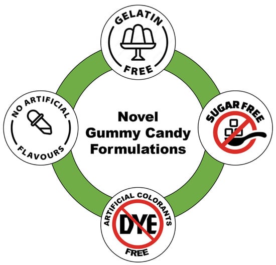 Novel formulations have opened doors for customization and personalization of food products, by introducing a variety of value-added ingredients, flavors, and other combinations. One significant aspect in the preparation of novel GCs is the incorporation of gelatin alternatives, such as pectin and agar gum, which allows manufacturers to create vegan gummies with unique textures and sensory properties. Furthermore, sugar-free formulations have become more prevalent, allowing individuals with dietary restrictions to indulge in these delightful treats without compromise []. Manufacturers have also begun to explore alternatives to artificial colors and flavors, opting for natural fruit extracts and plant-based dyes. This shift toward more natural ingredients not only enhances the appeal of GCs but also aligns with the growing demand for healthier confectionary foods (Figure 1).