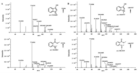 (A) MS/MS spectra of MMA and 3-hydroxyindole at m/z 134.06 using LC–HR–MS. (B) MS/MS spectra of MDA and N-methyl-3-hydroxyindole at m/z 148.0757 using LC–HR–MS.