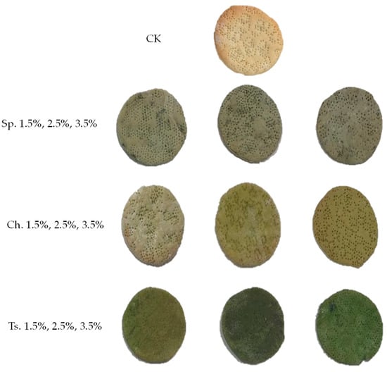 Crackers with microalgae biomass added in three flour substitution levels (1.5, 2.5 and 3.5%). Figure abbreviations Sp. Spirulina, Ch. Chlorella and Ts. Tetraselmis.