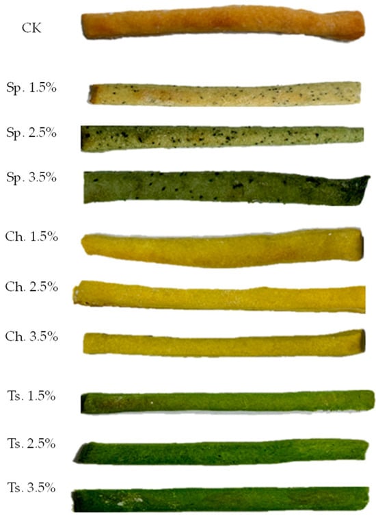 Grissini samples with microalgae biomass added in three flour substitution levels (1.5, 2.5 and 3.5%). Figure abbreviations Sp. Spirulina, Ch. Chlorella and Ts. Tetraselmis.