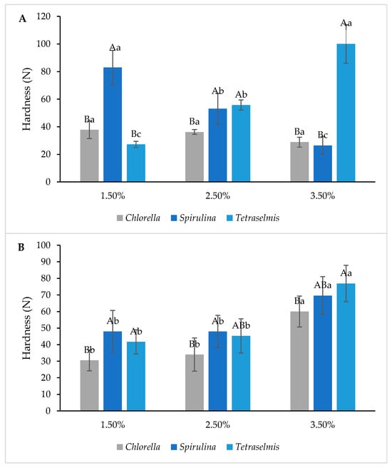 Section (A) of the figure represents the textural results of the crackers and section (B) is for the grissini results. Different capital letters indicate significant differences between formulations baked with different concentrations with the same microalgae. Different lowercase letters indicate significant differences between microalgae at the same concentration. The criterion for statistical significance was p < 0.05.