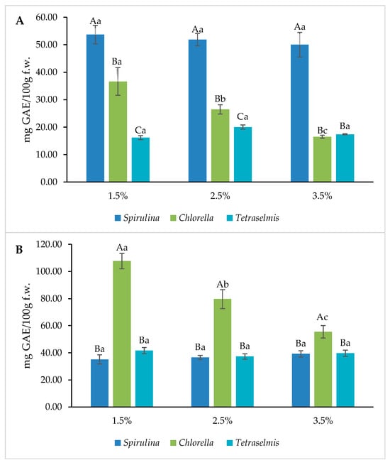 Total phenolic content (TPC) for microalgae containing samples. (A): Crackers and (B): Grissini. Different capital letters indicate significant differences between formulations baked at different concentrations with the same microalgae. Different lowercase letters indicate significant differences between microalgae at the same concentration. The criterion for statistical significance was p < 0.05.