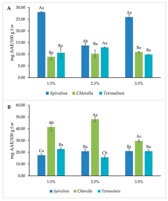 Ferric reducing antioxidant power (FRAP) for microalgae containing samples. (A): Crackers and (B): Grissini. Different capital letters indicate significant differences between formulations baked at different concentrations with the same microalgae. Different lowercase letters indicate significant differences between microalgae at the same concentration. The criterion for statistical significance was p < 0.05.