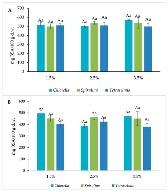 Total protein content for microalgae containing samples. (A): Grissini and (B): Crackers. Different capital letters indicate significant differences between formulations baked at different concentrations with the same microalgae. Different lowercase letters indicate significant differences between microalgae at the same concentration. The criterion for statistical significance was p < 0.05.