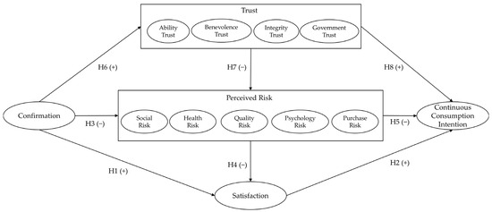 Information asymmetry is an important source of food safety issues and consumers’ perceived risk [35,36,37]. Under the background of information asymmetry, consumers cannot perceive and judge whether the credence-goods attributes of the food they consumed are safe. At this time, consumers will make judgments on the safety of the credence-goods attributes of food that they cannot confirm based on the credibility of the food enterprises and government regulations [38]. The result of this judgment will have an important impact on consumers’ purchasing decisions [39]. Therefore, in the context of food consumption, trust is an important tool to reduce perceived risk and facilitate transaction.