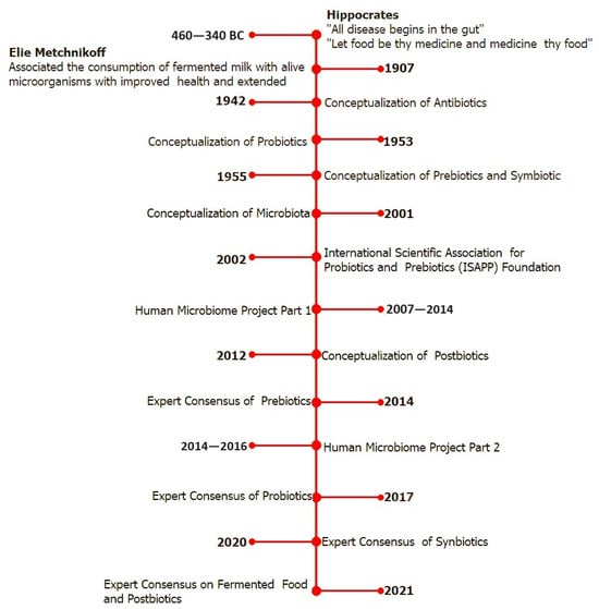 Figure 1. Schematic diagram illustrating the major historical milestones in the development of prebiotics, probiotics, synbiotics, and postbiotics.