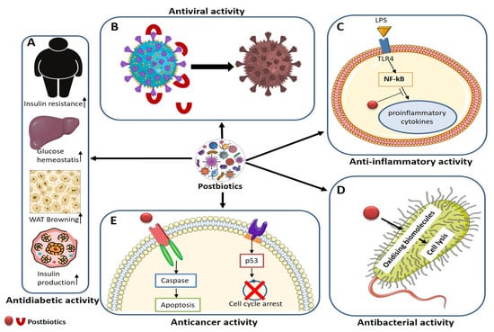 Figure 4. A scheme illustrating the possible mechanism and application of antidiabetic, antiviral, anti-inflammatory, antibacterial, and anticancer effects of postbiotics. (A) Postbiotics increase antidiabetic activity by increasing insulin production, WAT Browning, glucose homeostasis, and insulin resistance. (B) Postbiotics inhibit viral activity by blocking the receptor-binding site of a virus in the host system. (C) Anti-inflammatory activity by suppressing the production of proinflammatory cytokines. (D) Antibacterial activity by oxidizing biomolecules and forming pores in the membrane. (E) Anticancer activity by caspase activation, cell cycle arrest, and apoptosis.
