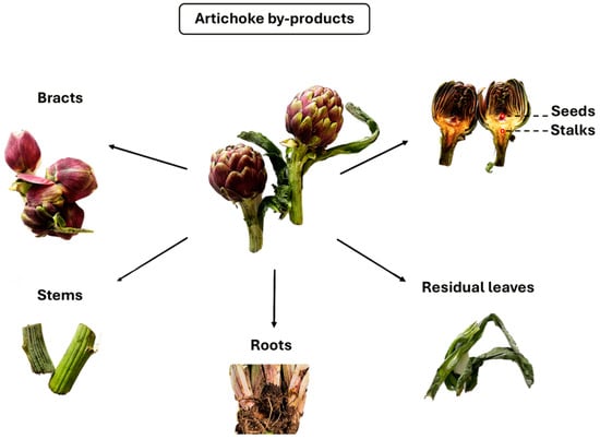 Globe artichoke-cultivation generates about 33 t/Ha of waste, and only a low percentage (15–30%) of artichoke by-products (ABPs) can be valorized (bracts and stems), while 70–85% is composed of residual biomass from cultivation [3,9,10]. This biomass consists of residual leaves, stalks, and roots and mainly contains carbon, nitrogen, ash, proteins, cellulose, inulin, and lignin [9].