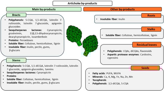Finally, artichoke seeds represent the less abundant ABPs. Depending on the different genotypes, protein and fat content ranges from 25.7 to 30.4 g/100 g dm and from 17.3 to 23.7 g/100 g dm, respectively. Fatty acids are mainly represented by polyunsaturated (PUFA) (60.43–70.64%) and monounsaturated fatty acids (MUFA, 13.08–19.71%). As regards minerals, Ca (734–1583 mg/100 g dm), K (493–880 mg/100 g dm), Mg (241–809 mg/100 g dm), and Fe (9.2–16 mg/100 g dm), and, in lower concentrations, Na (12–24 mg mg/100 g dm), Zn, and Mn are present. Tocopherols are also present, but in even lower amounts (1.83–4.46 mg/100 g dm). Among polyphenols, 5-CQA (22.5–35.8 mg/100 g dm) and 3,5-O-diCQA (197–418 mg/100 g dm) are the main ones represented [61]. Figure 2 summarizes ABPs’ chemical composition.