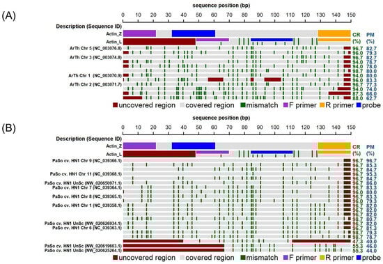 In silico analysis of actin oligonucleotides (Act-L and Act-Z) demonstrating significant alignments within the genomes of (A) Arabidopsis thaliana (Genome assembly TAIR10.1) and (B) Papaver somniferum (genome assembly ASM357369v1). Individual lanes in the diagram depict actin sequences (Act-L and Act-Z) along with the significant alignments produced through nucleotide BLAST (discontiguous megablast) for a 150 bp segment of the Act-Z sequence in the respective genome. Numbers within brackets indicate the sequence identifier. The positions of primers and probes corresponding to the actin sequences are detailed according to the legend provided below the plot. Dark green stripes emphasize mismatches relative to the original Act-Z sequence. The ‘Covered region’ (CR) and ‘Perfect match’ (PM) metrics specify the percentages of the Act-Z sequence aligned with, and perfectly matched to, the target sequence, respectively, while areas not aligned are marked in red. Abbreviations include “Chr” for chromosome, “UnSc” for unplaced scaffold, and “cv.” for cultivar.