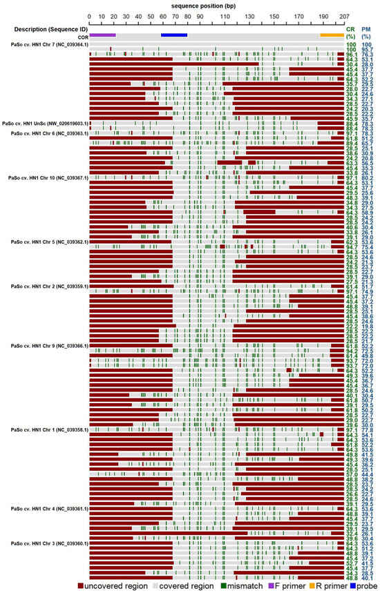 In silico analysis of codeinon reductase oligonucleotide (COR) demonstrating significant alignments within the genome of Papaver somniferum (genome assembly ASM357369v1). The individual lanes in the diagram depict COR sequence along with significant alignments generated within nucleotide BLAST (discontiguous megablast) for the genome of interest. Numbers within brackets indicate the sequence identifier. The positions of primers and probe corresponding to the cor sequences are detailed according to the legend provided below the plot. Dark green stripes emphasize mismatches relative to the original COR1 sequence. The “Covered region” (CR) and “Perfect match” (PM) metrics specify the percentages of the COR1 sequence aligned with, and perfectly matched to, the target sequence, respectively, while areas not aligned are marked in red. Abbreviations include “Chr” for chromosome, “UnSc” for unplaced scaffold, and “cv.” for cultivar.