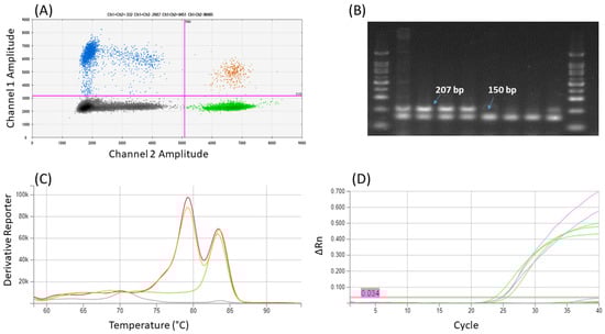 An example of results of duplex COR+Act-Z (A) ddPCR (2D plot): Four clusters of droplets were identified as single-positive for Channel 1—FAM (blue) and Channel 2—HEX (green), double-positive (orange) and double-negative (black); (B) Agarose gel after end-point PCR: Marker 100 bp, P. somniferum (Aplaus, Buddha, Maraton, Opal), P. orientale, P. nudicaule, P. rhoeas, P. somniferum (Postomi); (C) qPCR with EvaGreen (melting curves): P. somniferum in red and orange, P. nudicaule in green, NTC in grey color; (D) qPCR with probe: amplification curves with Act-Z (green—P. nudicaule, P. rhoeas) and COR (pink—P. somniferum) primers.
