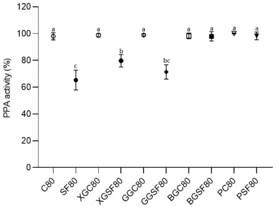 No PPA inhibitory activity was detected in heat-treated control beverages without saffron floral by-products, as expected. No statistically significant PPA inhibitory activity was detected either in the BGSF80 or the PSF80 model. The heat-treated model beverage without thickener SF80 showed the greatest inhibitory effect on PPA (~37%) since PPA activity was 62.46 ± 7.18%, followed by GGSF80 and XGSF80. The heat-treated model beverage with guar gum also presented similar inhibitory capacity on PPA (~29%), with the PPA activity being 71.42 ± 5.38%, without a statistically significant difference compared to SF80. However, statistically significant differences were found between XGSF80 and SF80, presenting inhibitory levels of about 20% on PPA, as the α-amylase activity in XGSF80 was 79.75 ± 4.59%.