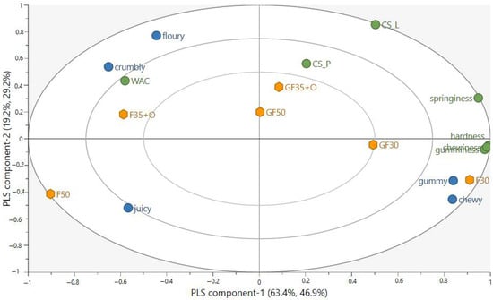 Partial least squares regression analysis (PLSR) was conducted to study the relationships of mechanical properties and WAC with the texture-related CATA attributes of gummy, chewy, crumbly, and floury. The PLSR was performed using SIMCA 17.0 software (Sartorius Stedim Data Analytics AB, Umeå, Sweden).