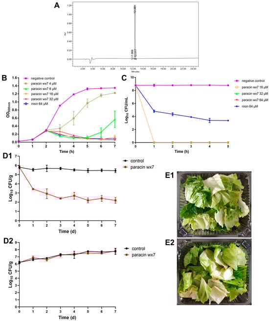 Antibacterial activity of paracin wx7 against E. faecalis in vitro and in fresh-cut lettuce. (A) Purity of paracin wx7 after HPLC; (B) effect of paracin wx7 on growth curve of E. faecalis; (C) effect of paracin wx7 on time-kill curve of E. faecalis; (D1) effect of paracin wx7 on vancomycin-resistant E. faecalis, (D2) effect of paracin wx7 on total bacteria in fresh-cut lettuce; (E1) fresh-cut lettuce with paracin wx7 treatment on the seventh day; (E2) fresh-cut lettuce control on the seventh day.