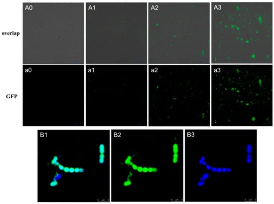 Using two dyes, cells with compromised membranes are considered to be dead and will show red (the fluorescence of PI), whereas cells with an intact membrane will show green (the fluorescence of SYTO9) [28]. Almost all cells of E. faecalis in the control were green (Figure 2(A0)). However, only a low proportion of E. faecalis cells were green after 1 × MIC paracin wx7 treatment (Figure 2(A1)). The red cells further increased with the increase in bacteriocin concentration (Figure 2(A2,A3)). At the same time, aggregated cells were observed by fluorescence microscope after the paracin wx7 treatment.