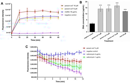 DiSC3(5) is a voltage-sensitive dye and can accumulate on the polarized membranes of cells, resulting in the quenching of fluorescence. When a membrane is depolarized, the dye is released into its surroundings, which can be measured by fluorescence intensity change [32,33]. The fluorescence intensity of the negative control rapidly decreased with time (Figure 4C). For a 1 μg/mL valinomycin treatment, fluorescence quenching was relieved. For a 4 μg/mL valinomycin treatment, the fluorescence intensity was relatively stable without a huge reduction. The 0.5 × MIC paracin wx7 treatment also showed relatively stable fluorescence intensity without a huge drop. Therefore, paracin wx7 had membrane depolarization.