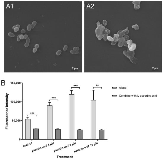 Effect of paracin wx7 on morphology (A) and ROS production (B) of E. faecalis. (A1) Cell morphology of E. faecalis for control, (A2) cell morphology of E. faecalis for paracin wx7 treatment. **: significant at p < 0.01; ***: significant at p < 0.001.