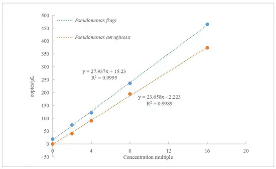 Linear relationship analysis of P. fragi and P. aeruginosa detected using dddPCR method.