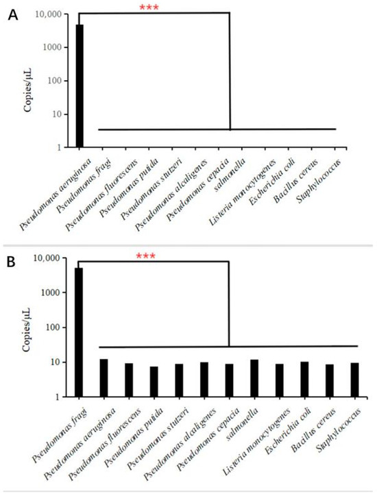 Specific results of dddPCR detection of P. aeruginosa and P. fragi. Note: (A) specific results of P. aeruginosa; (B) specific results of P. fragi. ***: The result is significant.
