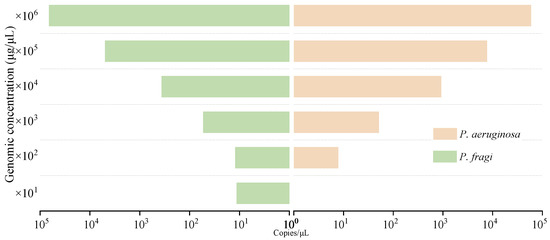 In the sensitivity evaluation of the bacterial suspension template, the detection limits of P. fragi and P. aeruginosa were all presented in single digits (Figure 5). At present, CRISPR technology is used to detect P. aeruginosa with a minimum of 50 cfu/mL [6]. Wang et al. detected Salmonella using digital PCR with a sensitivity of 10−4 ng/μL or 102 cfu/mL, which are lower values than the results detected in this assay [47]. According to the specific genes screened, the primers designed in this experiment showed a particularly good sensitivity. However, the high sensitivity of digital PCR limits the detection range to a certain extent. When the number of bacterial colonies exceeded 104 cfu/mL, the statistical results were invalid due to sufficient luminescent points when calculating the positive results. By combining a method with a DNAzyme sensor, Qin et al. found that P. aeruginosa can reach a concentration of 1.2 cfu/mL [45]. The detection results are comparable to the results of P. aeruginosa detection in this paper, and the detection range is wider. However, dddPCR can more easily achieve multiplex detection and a lower cost.