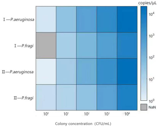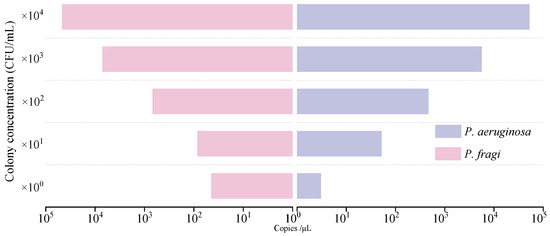 Bacteria usually coexist in a mixed population in food and environmental samples. In order to evaluate the accuracy of the reaction system in the presence of other interfering bacteria, different concentrations of P. fragi and P. aeruginosa were mixed with the natural background flora in the collected food samples. To obtain the natural background flora of milk, 25 mL of untreated fresh milk collected from pastures was cultured in 225 mL of LB at 37 °C for 18 h, and the natural background flora of cold fresh chicken was also enriched using this method. Plate counts were performed on all selected bacteria to determine the concentration of cells in the mix and gradually diluted to a concentration of N × 102–107 cfu/mL 1 < N < 10. The counting results showed that the concentration of natural background bacteria in raw milk was 5.4 × 107 cfu/mL, and the concentration of natural background bacteria in chicken was 1.72 × 108 cfu/mL. The genome of the mixed bacteria extracted from the gradient diluted flora was used for the template of dddPCR reaction.
