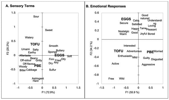 The emotional association (Figure 1B) separated the samples similarly to the sensory properties. The PBE was mainly associated with negative emotions (guilty, worried, disgusted, and aggressive). The eggs were associated with positive emotions (nostalgia, happy, calm, good-natured). The tofu sample was associated with interested, adventurous, enthusiastic, mild, active, free, and wild attributes.