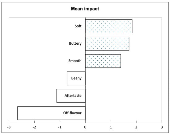 The sensory properties were combined with overall liking to identify the drivers of liking (Figure 2). The largest positive impact or hedonic lift was softness, followed by buttery and smoothness. Beany, aftertaste, and off-flavour attributes were found to negatively impact the participants’ liking.