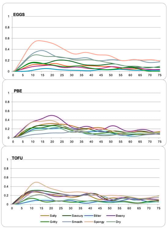 Line plots showing the proportion of citations for each sensory property at each time for the different samples are shown in Figure 3. The eggs and tofu were mainly described as spongy, especially in the first twenty seconds of evaluation, while the PBEs were described as beany. The eggs were mainly described using the textural attributes, which were smooth, spongy, and dry. The evaluation of the PBEs was dominated by the taste and flavour attributes (beany, bitter, savoury, and salty) as well as grittiness. The tofu was also found to be salty, beany, and savoury, but was also described as spongy and smooth. The results are reinforced by the average proportions of citations included in Table 3. The PBE was found to be significantly saltier and more beany than other samples, as well as being grittier (p < 0.05). The egg samples were significantly less salty, savoury, bitter, and beany than the PBE and tofu samples (p < 0.05). Furthermore, on average, smooth, spongy, and dry attributes were selected more often for the egg sample than the tofu and PBE samples (p < 0.05).