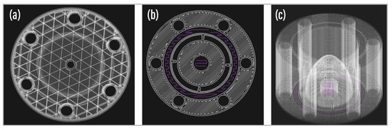 Visualization of print parameter settings in Markforged software. (a) Two-dimensional view showcasing the triangular fill pattern on the outlet cap. (b) Visualization depicting the layer height pattern at the base of one nozzle body. (c) Three-dimensional view presenting the second nozzle body with a hidden fill pattern.
