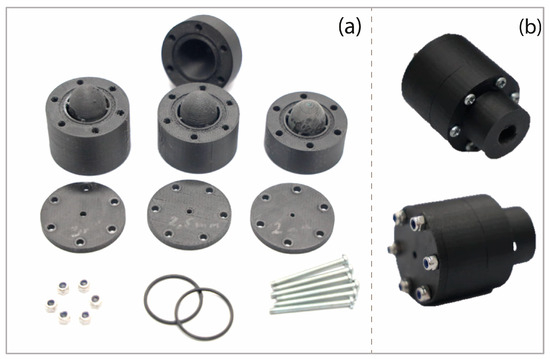 The fabrication and assembly of the parts were carried out in two stages. The first stage involved the 3D printing of the main parts, and the second stage focused on the assembly. The 3D-printed parts were manufactured using Onyx material and a 3D Printer Markforged two both from the brand Markforged Inc. (Billerica, MA, USA). Before proceeding with these steps, bilateral geometrical tolerances were determined for the depth and internal diameter of the housing groove in the bodies and the nozzle cap. The slot size was precisely dimensioned to allow the O-ring to deform against the cavity walls when the bolts are tightened. This design choice ensures effective sealing during operation.