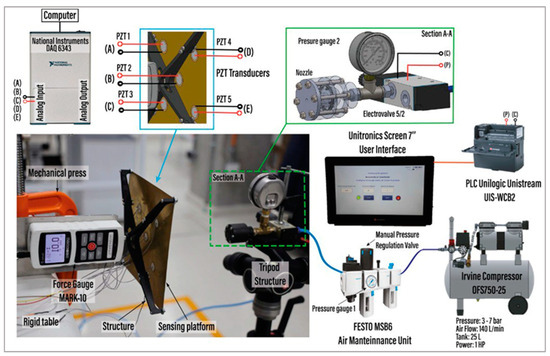The pneumatic actuator nozzle device assembly involved connecting the nozzle to the solenoid valve outlet using two unions with 1/8 NPT external threads and a tee with a 1/8 NPT internal thread, which also accommodated a pressure gauge. The assembly was securely fixed to a support tripod using a C-type press, as shown in Figure 4. A PLC (Unilogic Unistream UIS-WCB2) was implemented, where the coil of the 3/2 solenoid valve was connected to the digital output of the PLC and the negative port. Additionally, a 7-inch display was installed and connected to the PLC UPS. A Ladder language program was developed using the manufacturer’s Unilogic software, creating a user interface to define the opening frequency and the number of air discharges in the solenoid valve. For measuring the impact force level of the device, a system was implemented, comprising a brass platform coupled to a MARK-10 force sensor via a PLA printed structure. The brass platform held five piezoelectric transducers bonded with epoxy adhesive (Loctite super bonder) and positioned as illustrated in Figure 4. The piezoelectric transducers were connected to the analog input of a National Instruments NI 6343 acquisition board to acquire vibration signals. MATLAB R2021 software was used to develop a code for data collection. During the experiment, the nozzle was positioned at a 25 cm separation from the brass platform of the measurement system, with the air outlet hole pointing towards the center of the brass plate. Force and voltage measurements were acquired after conducting shooting tests for each of the nine nozzle configurations. This experimental design aimed to understand the influence of varying cavity length and nozzle outlet diameter on the impact force produced.