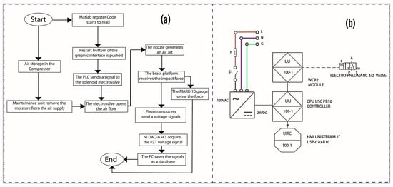 The experiment controlled the air outlet pressure through a regulating valve in the pneumatic maintenance unit. This unit not only regulated the working pressure but also removed moisture from the air compressor. The experiment began by executing a MATLAB code to enable the board for data reading, followed by activating the solenoid valve from the user interface to trigger the impact measurement system board. Concurrently, the maximum peak force was recorded on the MARK-10 force sensor display. A sampling rate of 1000 Hz and a data acquisition time of 10 s were configured in the MATLAB code to capture the vibration signal with the piezoelectric transducers. The measurement data, dependent on nozzle, pressure, and firing frequency, were then collected and stored in databases. The flowchart for this experimental process in Stage 1 is described in Figure 5a.