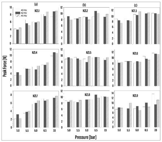The force measurements obtained for the impact tests performed in the experimental stage are shown in Figure 6. Each graph represents the three firing frequencies (40, 42, and 45 Hz) plotted against the five pressure levels (5–7 bar) for the nine nozzle configurations. Notably, distinct force behavior trends emerged at each pressure level. Nozzles NZL4 and NZL7 exhibited a linear increase in force from 5 to 7 bar, as represented in Figure 6a. In contrast, nozzles NZL1, NZL2, NZL5, and NZL8 demonstrated similar force levels close to 10 N across all frequencies and pressure states. Meanwhile, nozzles NZL6 and NZL9 displayed similar force behaviors between 5 and 6 bar, with a noticeable increase in force observed from 6.5 bar for NZL6 and from 7 bar for NZL7. Notably, NZL3 showcased the highest force levels between 6 and 7 bar, with nearly identical force levels nearing 12 N, while the lowest levels were observed between 5 and 5.5 bar, with values approaching 10 N. Across the studied frequency levels, most nozzles exhibited comparable force measurements at nearly all pressure levels, with a few exceptions. For instance, at 7 bar, NZL9 exhibited a significant increase in force at 40 Hz compared to the measurements at 42 and 45 Hz.