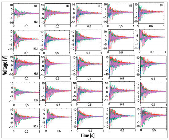 Vibration voltage measurements obtained from NZL1-NZL5 piezoelectric transducers. (a) 5 bar. (b) 5.5 bar. (c) 6.0 bar. (d) 6.5 bar. (e) 7 bar. Only five nozzles are shown. Black: PZT1; Red: PZT2; Blue: PZT3; Green: PZT4; Purple: PZT 5.