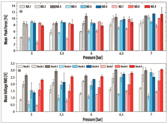 (a) Mean peak force measured between 5 and 7 bar of pressure and (b) mean RMS voltage measured between 5 and 7 bar for the nine nozzle configurations.