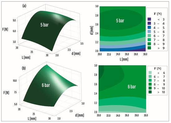 The response surfaces and contour plots corresponding to Equations (1) and (2) are presented in Figure 9a,b, respectively. At 5 bar (see Figure 9a), an experimental zone is observed with parameter values ranging from 2.5 to 2.9 mm for d, and from 16.88 to 25.88 mm for L. At 6 bar (see Figure 9b), the zone lies between 2.7 and 3.0 mm for L, and between 16.88 and 18.0 mm for d. The contour plots indicate that forces above 9 N can be generated at 5 bar, and forces above 10 N at 6 bar, within the regions of interest.