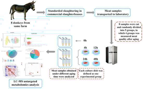 Liaocheng University’s Animal Care and Ethics Committee approved this research (No. 2023042602). Donkeys were slaughtered at a commercial slaughterhouse (Dong’e Tianlong Food Co., Ltd., Liaocheng, China). The Longissimus thoracis (LT) were obtained from donkey carcasses as the samples in this research. Eight male donkeys were selected randomly and slaughtered at the age of 24 months with an ante-mortem weight of 220 ± 15 kg. All the donkeys were transported from the same farm, fasted for 12 h before slaughter, and provided free access to water. The animals were stunned and then bled, and the hides were removed based on commercial practices. The LT muscle from the right side of the carcasses was excised within 30 min postmortem, and the samples were designated as 0 h. The LT muscles were cut into 7 × 7 × 5 cm cubes, placed into a sterile culture dish, and then randomly assigned to one of the following aging times: 4 h, 12 h, 24 h, or 48 h (Figure 1). Aging was performed in a refrigerator at 4 ± 1 °C, without illumination. The cooking loss and shear force were measured after 4 h, 12 h, 24 h, and 48 h of aging. Samples were collected (10 g) from the inside of LT muscles after aging for 0 h, 4 h, 12 h, 24 h, and 48 h. The collected samples were placed in a liquid nitrogen tank immediately and then transferred to a refrigerator at −80 °C for metabolomics analysis.