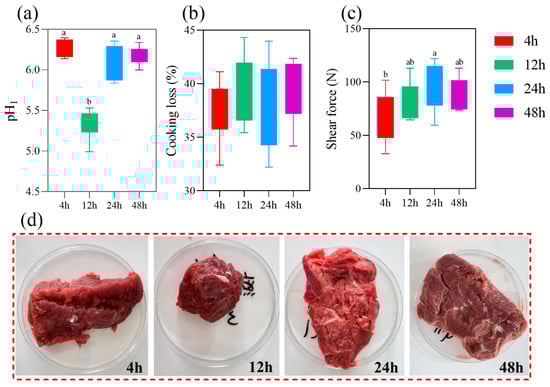 Comparison of quality traits during early postmortem aging of donkey meat. (a) pH value. (b) Cooking loss. (c) Shear force. (d) The picture of donkey meat treated with different aging times. Values with different letters (lower a and b) in the bar chat indicate significant differences (p < 0.05).