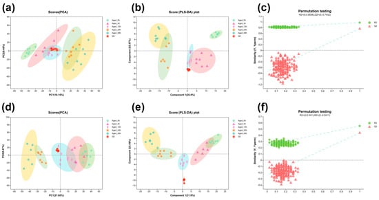 UHPLC–MS detected 6738 peaks, including 3475 positive ion peaks and 3263 negative ions, in samples with different aging times after slaughter. A total of 625 metabolites were identified, including 453 positive ion mode metabolites and 172 negative ion mode metabolites. To discriminate the metabolites among different aging times, a PCA analysis was obtained. The PCA results showed that all the samples were within the 95% confidence interval (Figure 3a,d), as well as the obvious differences among the groups. As the time of aging increased, the differences between 0 h and other hours gradually expanded. The PCA results of 4 h were close to 12 h and 24 h, indicating that the difference in metabolites between them was relatively small. In addition, a PLS-DA model was performed. The PSL-DA model has revealed significant differences between these groups (Figure 3b,e), and the slope of the cross-validated straight line is moderate for 200 permutations, indicating that the PLS-DA model does not exceed the fit in this study (Figure 3c,f), thus indicating that the PLS-DA model was reliable. The results indicated the characteristic differences in metabolites among samples of different aging times. Generally, PCA and PLS-DA multivariate statistical analyses produced highly coincident results.