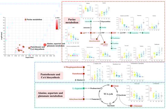 The pathways of donkey meat metabolism that affect postmortem aging were determined based on changes in differential endogenous metabolites of donkeys and pathways reported in the KEGG database. These results demonstrate that donkey meat from different aging times reacts to changes in metabolites, which affects its quality. A pathway topology analysis of the different metabolites among the five aging samples was conducted to investigate the most key pathways related to the metabolic response to donkey meat with different aging times. The result can be seen in Figure 4, and the pathway impact and p values can be seen in Table 2. Twenty pathways were predicted, and five pathways had impact values greater than 0.15 and p < 0.05. These pathways included alanine, aspartate, and glutamate metabolism, pantothenate and CoA biosynthesis, the citrate cycle (TCA cycle), purine metabolism, and caffeine metabolism.