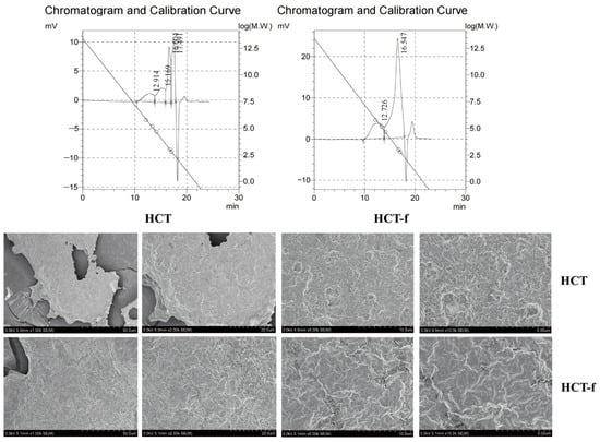 The changes in molecular weight size of both HCT and HCT-f samples were determined using gel permeation chromatography (GPC). The samples were coated with gold on the sample surface and observed using the FEI Nova Nano SEM 450 instrument (Thermo Fisher Scientific, Waltham, MA, USA).