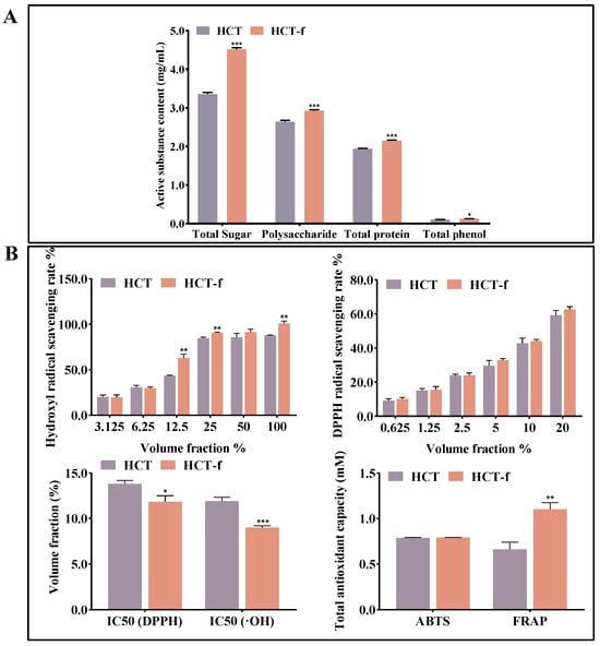 As can be seen in Figure 3A, HCT and HCT-f were rich in total sugars, polysaccharides, and total proteins, and showed reduced polyphenolic compounds. After fermentation, a significant increase in the content of all four bioactive substances occurred. The total sugar content and polysaccharide content of HCT-f were both significantly higher compared to HCT, at 4.52 and 2.92 mg/mL, respectively.