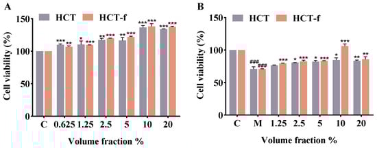 Effect of HCT and HCT-f on the viability of HaCaT cells. (A) Effect of 0.625–20% volume fraction of HCT and HCT-f on HaCaT cell viability. (B) Effect of 1.25–20% volume fraction of HCT and HCT-f on the viability of HaCaT cells with LPS-induced injury. (C: not subjected to LPS-induced injury; M: subjected to LPS-induced injury only, no sample added.) One-way ANOVA was performed to determine statistical significance. * p < 0.05, ** p < 0.01, *** p < 0.001 vs. the control group; ### p < 0.001 vs. the control group, * p < 0.05, ** p < 0.01, *** p < 0.001 vs. the model group.