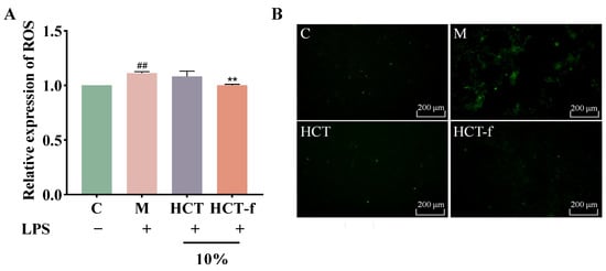 From Figure 5B, it can be seen that the intensity of green fluorescence was significantly enhanced in group M after LPS induction compared to group C without LPS induction. The intensity of green fluorescence was weakened after treatment with both HCT and HCT-f at a volume fraction of 10%. Additionally, the effect of HCT-f was superior to that of HCT. Figure 5A shows that after LPS injury, the relative expression of ROS in group M was significantly increased. Treatment with both HCT and HCT-f reduced the generation of ROS. The inhibitory effect of HCT-f on the generation of ROS was superior to that of HCT.